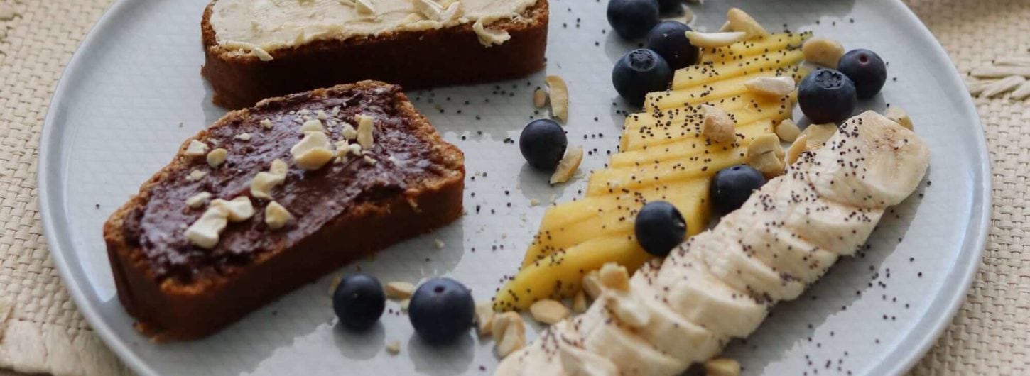- Banana bread necháme vychladnout a nakrájíme na menší kousky. Ty natřeme oříškovými krémy, ozdobíme ovocem, mákem a mletým kokosem.