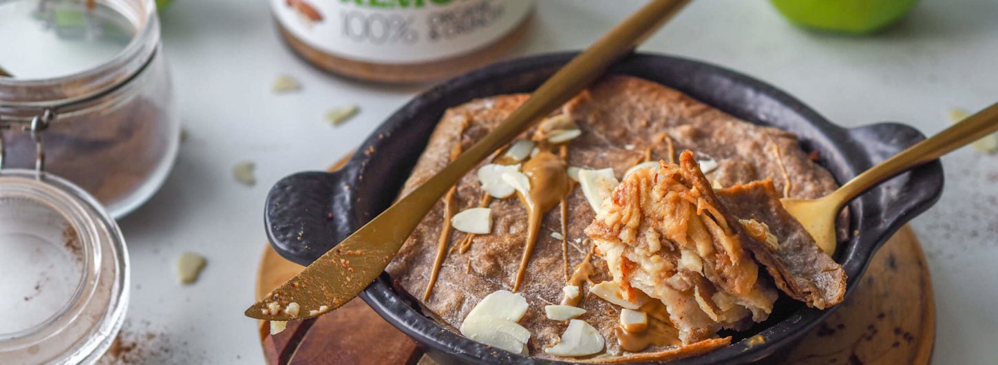 - Spodok zapekacej misky si vytrieme troškou ghee a uložíme prvý plát. Natrieme naň mandľový krém a posypeme nastrúhaným jablkom.