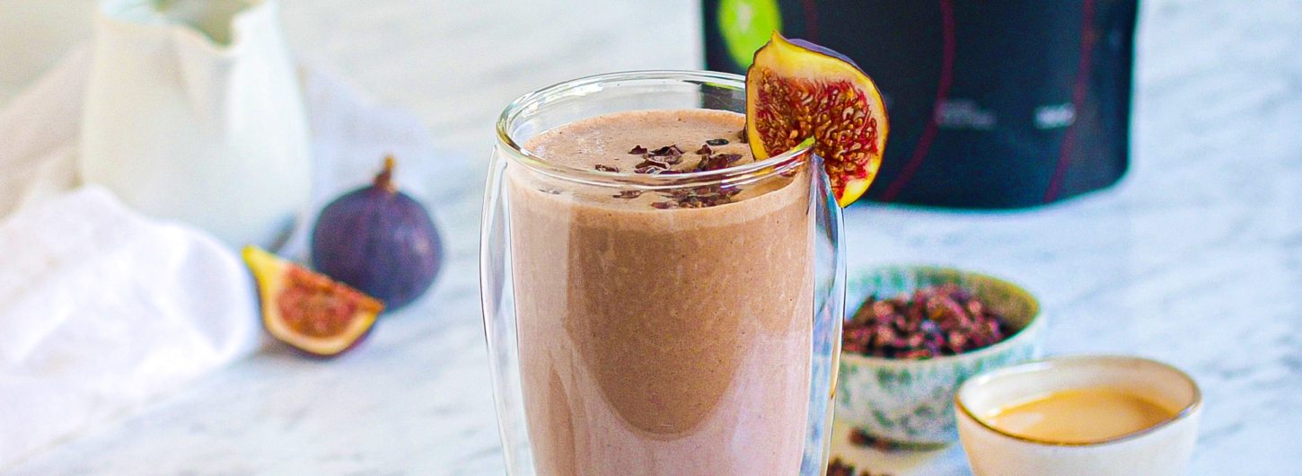 - Do výkonného mixéru dáme 1 zrelý banán, 2 mäkké figy, 150 ml rastlinného mlieka a 1 PL Powerlogy Nougatu (môžete vynechať, ale pre krémovú chuť je to ideálne)