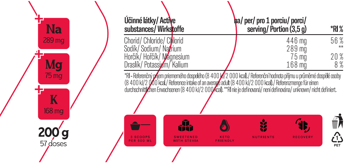 Elektrolytový komplex se 3 minerály v každé dávce pro každodenní hydrataci. Obsahuje 289 mg sodíku, 168 mg draslíku a 75 mg hořčíku ve formě chelátového magnesium malátu s lepší vstřebatelností.