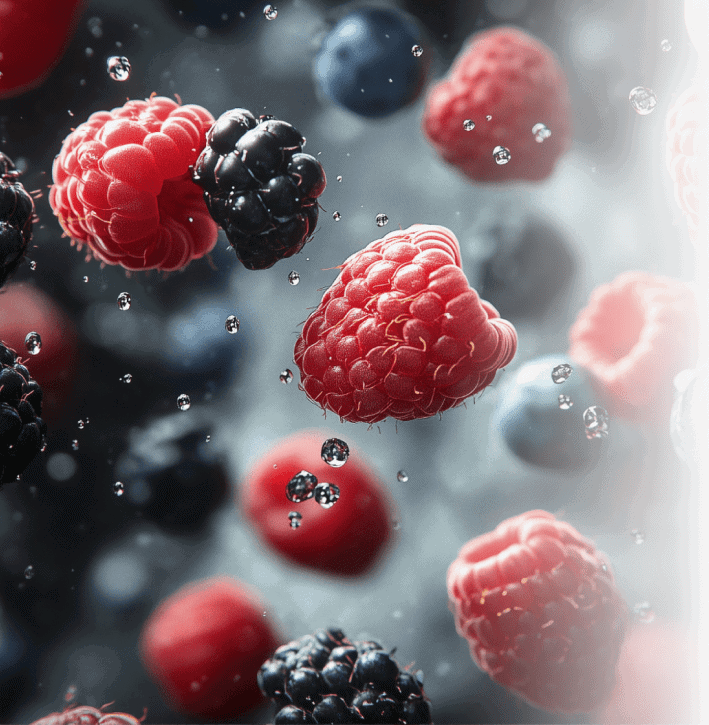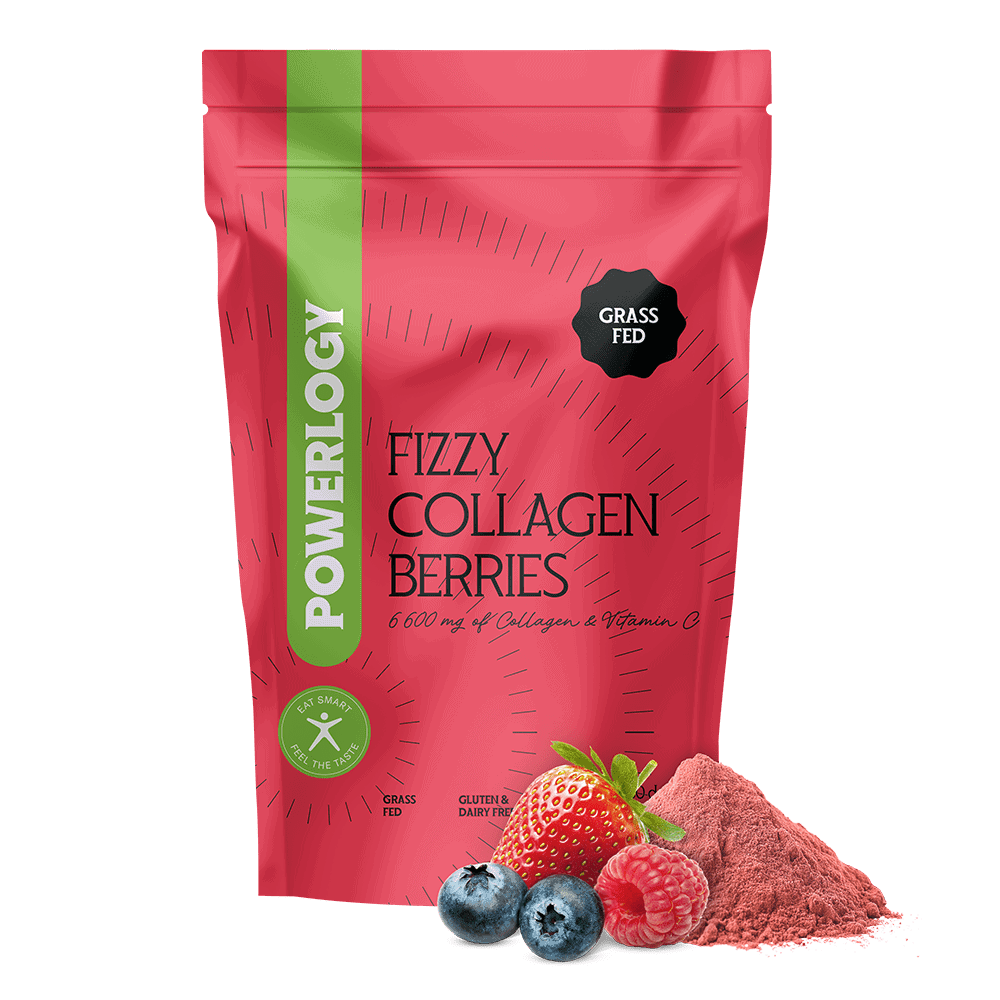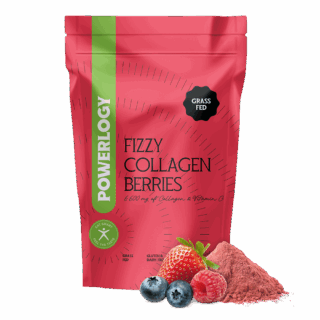 - Přidejte perlivou vodu a 10 g Powerlogy Fizzy Collagen Berries. Dobře promíchejte.