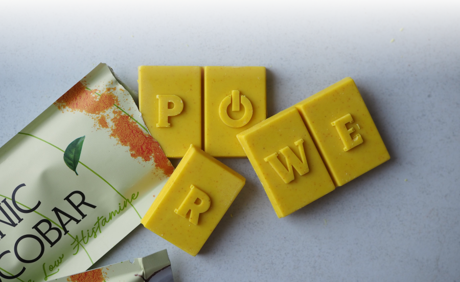 Kakaové máslo a protizánětlivá kurkuma, to je chutná a funkční čokoláda bez alergenů.